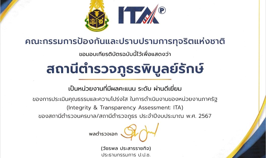 สภ.พิบูลย์รักษ์ เป็นหน่วยงานที่มีผลคะแนนระดับผ่านดีเยี่ยม ตามโครงการประเมินคุณธรรมฯ ประจำปีงบประมาณ พ.ศ.2567 7 มกราคม 2568 โดย admin / ข่าวประชาสัมพันธ์ Post Views: 45 สภ.พิบูลย์รักษ์ เป็นหน่วยงานที่มีผลคะแนนระดับผ่านดีเยี่ยม ตามโครงการประเมินคุณธรรมและความโปร่งใสในการดำเนินงานของหน่วยงานภาครัฐ (Integrity and Transparency Assessment: ITA) ของสถานีตำรวจ ประจำปีงบประมาณ พ.ศ.2567